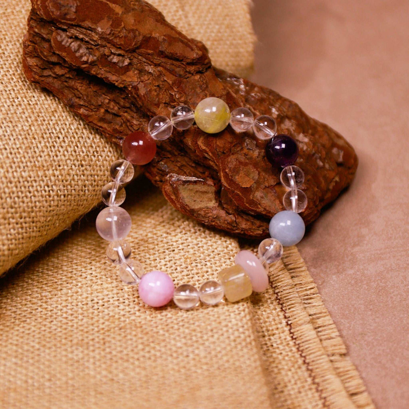 This vibrant natural crystal bracelet is a celebration of balance and grounding, crafted to harmonize your energy and connect you to the Earth. It features a radiant mix of clear quartz, soft rose quartz, sunny yellow rutilated quartz, and soothing amethyst. Each bead brings its unique energy, while the luminous clear quartz unifies the design. More than jewelry, this bracelet is a spiritual anchor, blessed to foster emotional harmony, stability, and joyful balance in your daily life.
